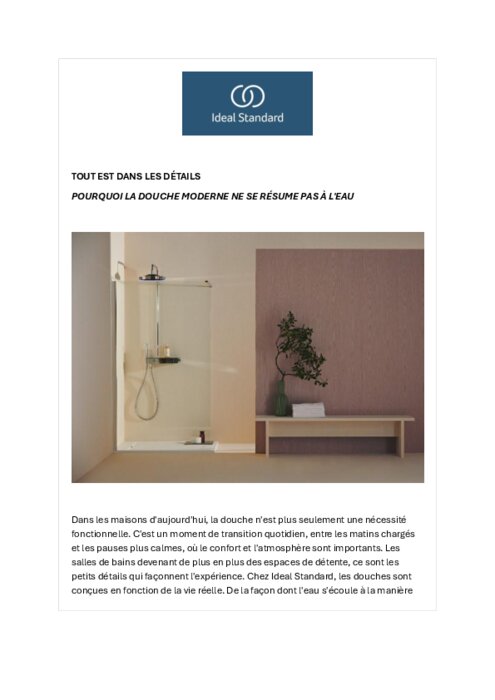 Dans les maisons d'aujourd'hui, la douche n'est plus seulement une nécessité fonctionnelle. C'est un moment de transition quotidien, entre les matins chargés et les pauses plus calmes, où le confort et l'atmosphère sont importants. Les salles de bains devenant de plus en plus des espaces de détente, ce sont les petits détails qui façonnent l'expérience. Chez Ideal Standard, les douches sont conçues en fonction de la vie réelle. De la façon dont l'eau s'écoule à la manière dont les produits s'intègrent dans différents intérieurs, chaque élément est pensé pour trouver l'équilibre entre design, technologie et fonctionnalité au quotidien.