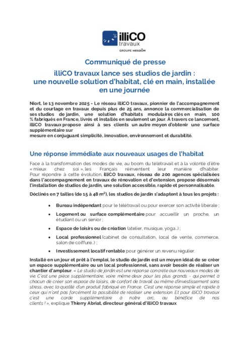 Le réseau illiCO travaux, pionnier de l’accompagnement et du courtage en travaux depuis plus de 25 ans, annonce la commercialisation de ses studios de jardin, une solution d’habitats modulaires clés en main, 100 % fabriqués en France, livrés et installés en seulement un jour. À travers ce lancement, illiCO travaux propose ainsi à ses clients un autre moyen d’obtenir une surface supplémentaire sur mesure en conjuguant simplicité, innovation, environnement et durabilité.
