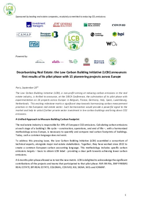 La Low Carbon Building Initiative (LCBI), une organisation à but non lucratif visant à réduire les émissions de carbone dans le secteur de l'immobilier, est ravie d'annoncer l'aboutissement de sa phase pilote avec l'expérimentation de 16 projets à travers l'Europe : en Belgique, en France, en Allemagne, en Italie, en Espagne, au Luxembourg et aux Pays-Bas. Cette étape passionnante marque un pas important vers l'harmonisation des pratiques de mesure du carbone dans le secteur immobilier européen.