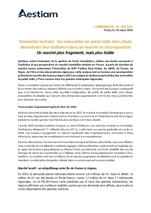 Aestiam, acteur historique de la gestion de fonds immobiliers, réalise une étude consacrée à l’évolution et aux perspectives du marché immobilier tertiaire en France. A partir de données de marché issues notamment d’ImmoStat, de BNP Paribas Real Estate, de CBRE, de l’Insee, de l’Apec, de l’Orie et des observatoires régionaux, cette analyse met en lumière une recomposition profonde du marché des bureaux depuis 2022 et souligne la résilience particulière des immeubles de petite taille, à Paris comme dans les grandes métropoles régionales.