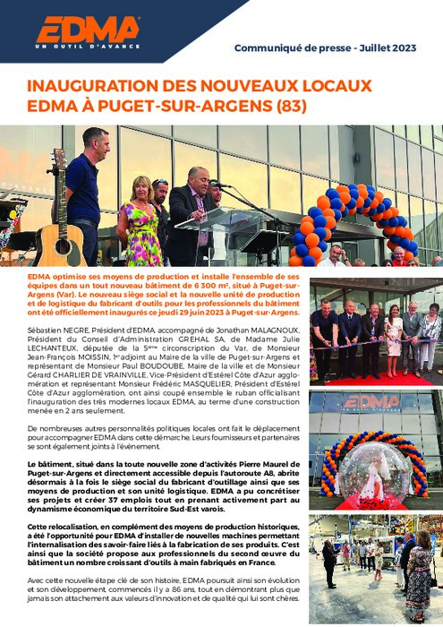 EDMA optimise ses moyens de production et installe l’ensemble de ses équipes dans un tout nouveau bâtiment de 6 300 m², situé à Puget-surArgens (Var). Le nouveau siège social et la nouvelle unité de production et de logistique du fabricant d’outils pour les professionnels du bâtiment ont été officiellement inaugurés ce jeudi 29 juin 2023 à Puget-sur-Argens.