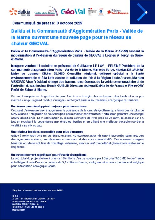 Inauguré vendredi 3 octobre en présence de Guillaume Le Lay-Felzine Président de la communauté d’agglomération Paris - Vallée de la Marne, Maire de Torcy, Nicolas Delaunay maire de Lognes, Olivier Blond conseiller régional, délégué spécial à la Santé environnementale et à la lutte contre la pollution de l’air à la Région Ile-de-France, Mathieu Viskovic vice-président chargé des travaux, des réseaux, de la voirie communautaire et de l’entretien du patrimoine, Benoit Guiblin directeur régional Dalkia Ile-de-France et Pierre Ory Préfet de Seine-et-Marne.