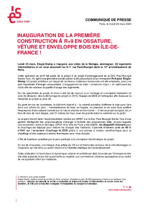 Industriels 26 mars 2024 - 09:46 Elogie-Siemp a inauguré, aux côtés de la Sémapa, aménageur, 38 logements intermédiaires et un local associatif au 9-11 rue Paul-Bourget dans le 13e arrondissement de Paris. PDF (1 Mo) Télécharger Crédit photos : Hervé Abaddie / Elogie-Siemp