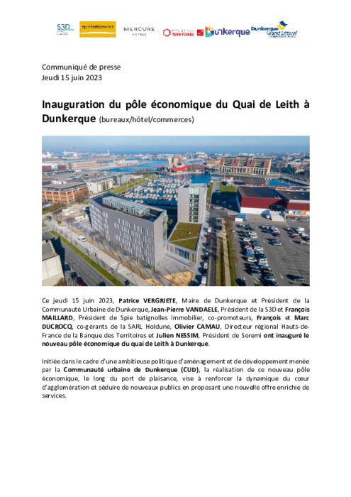 Ce jeudi 15 juin 2023, Patrice VERGRIETE, maire de Dunkerque et président de la Communauté Urbaine de Dunkerque, Jean-Pierre VANDAELE, président de la S3D et François MAILLARD, président de Spie batignolles immobilier, co-promoteurs, François et Marc DUCROCQ, co-gérants de la SARL Holdune, Olivier CAMAU, directeur régional Hauts-de- France de la Banque des Territoires et Julien NESSIM, président de Soremi ont inauguré le nouveau pôle économique du quai de Leith à Dunkerque.