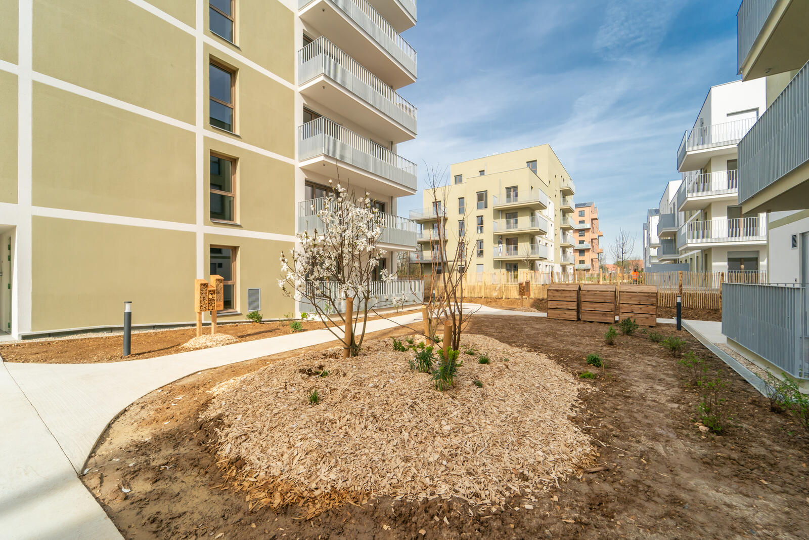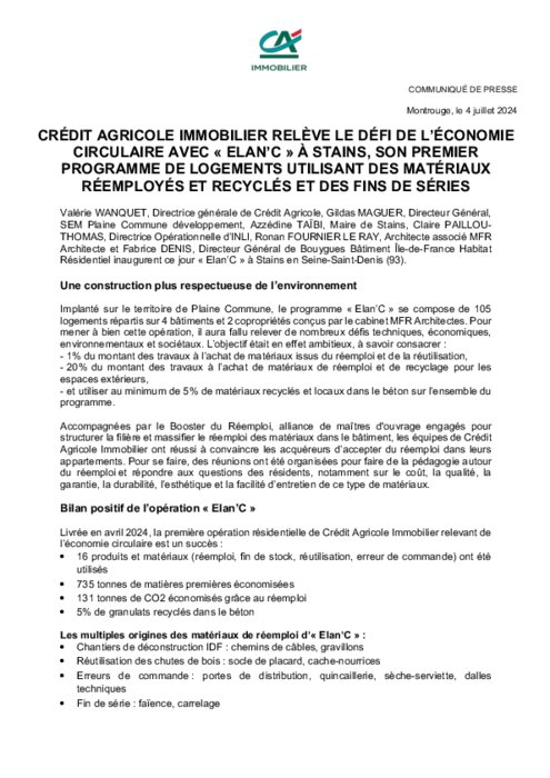 Valérie Wanquet, directrice générale de Crédit Agricole, Gildas Maguer, directeur général SEM Plaine Commune développement, Azzédine Taïbi, Maire de Stains, Claire Paillou-Thomas, directrice opérationnelle d’INLI, Ronan Fournier, architecte associé MFR et Fabrice Denis, directeur général de Bouygues Bâtiment Île-de-France Habitat Résidentiel ont inauguré "Elan’C" à Stains, en Seine-Saint-Denis (93).