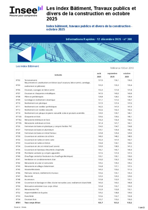 L’index bâtiment, travaux publics et divers de la construction d’octobre 2025 enregistre une évolution notable, reflétant les tensions persistantes sur les coûts des matériaux et de la main-d’œuvre. Les entreprises du secteur observent une dynamique contrastée, avec des segments comme le gros œuvre plus fortement impactés que les activités de second œuvre.