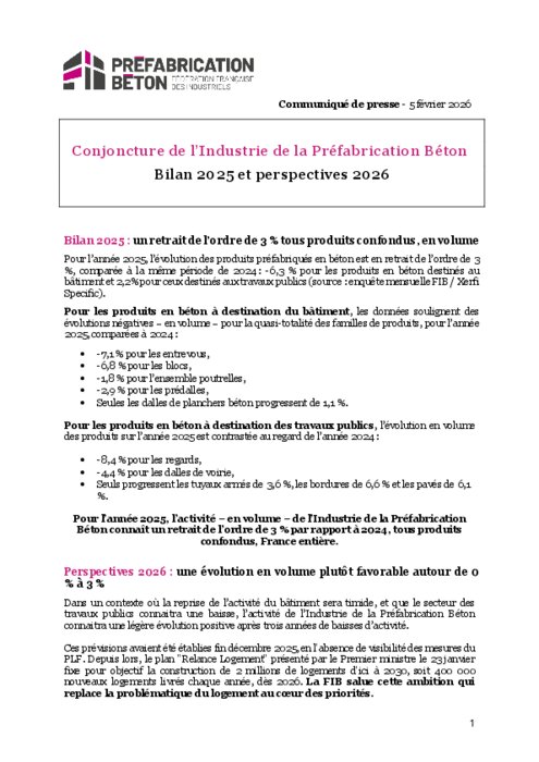 Pour l’année 2025, l’évolution des produits préfabriqués en béton est en retrait de l’ordre de 3 %, comparée à la même période de 2024 : -6,3 % pour les produits en béton destinés au bâtiment et 2,2% pour ceux destinés aux travaux publics (source : enquête mensuelle FIB / Xerfi Specific).