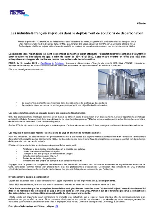 Menée auprès de 110 décideurs, essentiellement dans l’industrie du métal, du génie civil, du bâtiment et du transport, issus d’entreprises industrielles de toutes tailles (PME, ETI, Grands Groupes), l’étude de CertiNergy & Solutions et Industrie & Technologies révèle les enjeux et le niveau de maturité en matière de décarbonation au sein des entreprises industrielles.