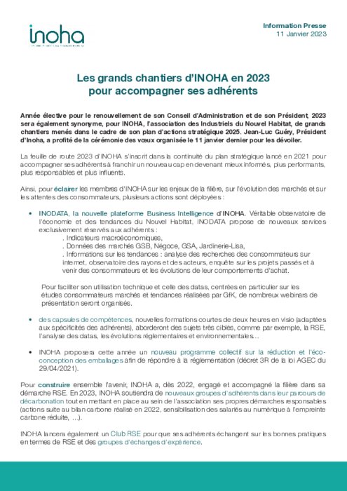 Année élective pour le renouvellement de son Conseil d’Administration et de son Président, 2023 sera également synonyme, pour INOHA, l’association des Industriels du Nouvel Habitat, de grands chantiers menés dans le cadre de son plan d’actions stratégique 2025. Jean-Luc Guéry, Président d’Inoha, a profité de la cérémonie des vœux organisée le 11 janvier dernier pour les dévoiler.