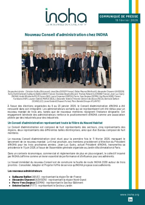 À l'issue des élections organisées du 9 au 23 janvier 2026, le Conseil d'administration d'INOHA (Association professionnelle des Industriels du Nouvel Habitat) a été renouvelé dans son intégralité. Les administrateurs sortants qui se représentaient ont été réélus pour un nouveau mandat de trois ans, tandis que de nouveaux membres rejoignent l'instance dirigeante. Cet engagement bénévole des administrateurs renforce le positionnement d'INOHA comme une association pilotée par des industriels pour des industriels.