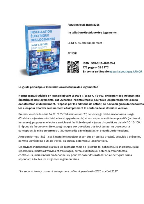 Norme la plus utilisée en France (devant la 9001 !), la NF C 15-100, encadrant les installations électriques des logements, est LA norme incontournable pour tous les professionnels de la construction et du bâtiment. Proposé par les éditions de l’Afnor, ce nouveau guide donne toutes les clés pour aborder sereinement et simplement le contenu de sa dernière version.