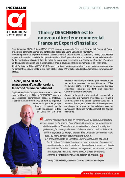 Depuis janvier 2024, Thierry DESCHENES occupe le poste de Directeur Commercial France et Export d’Installux, gammiste aluminium, dont le siège est situé à Saint-Bonnet-de-Mure (69). Avec son parcours d’expert commercial spécialisé dans le second œuvre du bâtiment, Thierry DESCHENES a pour mission de consolider la dynamique de la PME lyonnaise, dans un contexte sectoriel contraint.