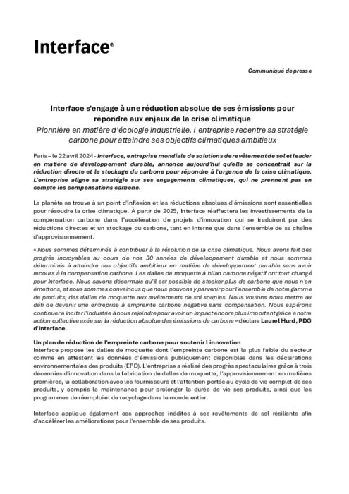 Interface, entreprise mondiale de solutions de revêtement de sol etleader en matière de développement durable, annonce aujourd'hui qu'elle se concentrait sur la réduction directe et le stockage du carbone pour répondre à l'urgence de la crise climatique. L'entreprise aligne sa stratégie sur ses engagements climatiques, qui ne prennent pas en compte les compensations carbone.