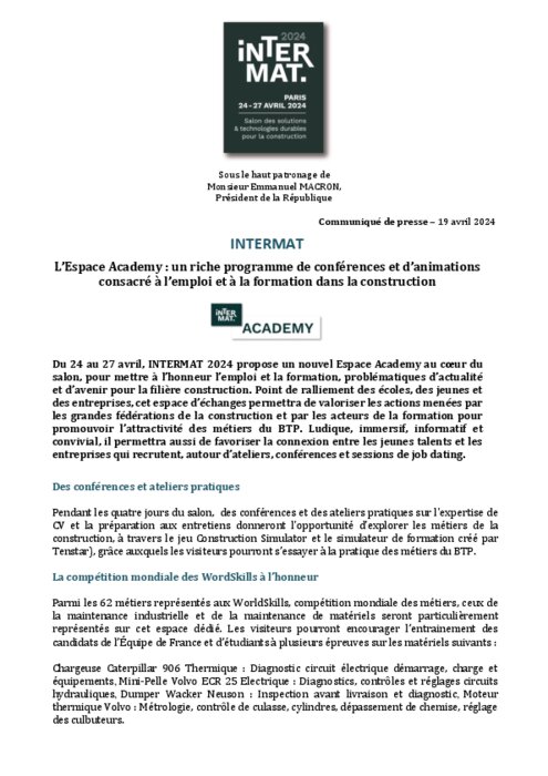 Du 24 au 27 avril, INTERMAT 2024 propose un nouvel Espace Academy au cœur du salon, pour mettre à l’honneur l’emploi et la formation, problématiques d’actualité et d’avenir pour la filière construction. Point de ralliement des écoles, des jeunes et des entreprises, cet espace d’échanges permettra de valoriser les actions menées par les grandes fédérations de la construction et par les acteurs de la formation pour promouvoir l’attractivité des métiers du BTP.