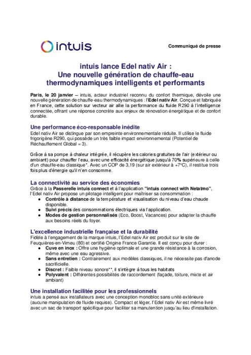 intuis, acteur industriel reconnu du confort thermique, dévoile une nouvelle génération de chauffe-eau thermodynamiques : l’Edel nativ Air. Conçue et fabriquée en France, cette solution sur vecteur air allie la performance du fluide R290 à l’intelligence connectée, offrant une réponse concrète aux enjeux de rénovation énergétique et de confort durable.