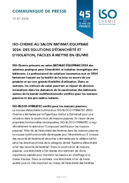 ISO-Chemie présente au salon BATIMAT/ÉQUIPBAIE 2024 des solutions pratiques pour l'étanchéité et l'isolation énergétique des bâtiments. Le professionnel des solutions innovantes met en 2024 fortement l'accent sur la facilité de la mise en œuvre de ses produits et sur une grande flexibilité d'utilisation.