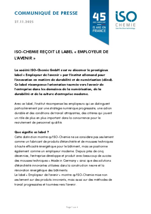 La société ISO-Chemie GmbH s'est vu décerner le prestigieux label « Employeur de l'avenir » par l'Institut allemand pour l'innovation en matière de durabilité et de numérisation (diind). Ce label récompense l'orientation tournée vers l'avenir de l'entreprise dans les domaines de la numérisation, de la durabilité et de la culture d'entreprise moderne.