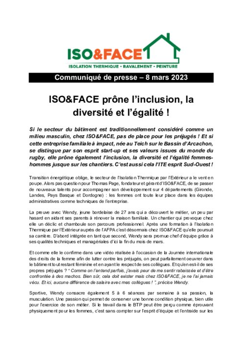Si le secteur du bâtiment est traditionnellement considéré comme un milieu masculin, chez ISO&FACE, pas de place pour les préjugés ! Et si cette entreprise familiale à impact, née au Teich sur le Bassin d’Arcachon, se distingue par son esprit start-up et ses valeurs issues du monde du rugby, elle prône également l’inclusion, la diversité et l’égalité femmes-hommes jusque sur les chantiers. C’est aussi cela l’ITE esprit Sud-Ouest.