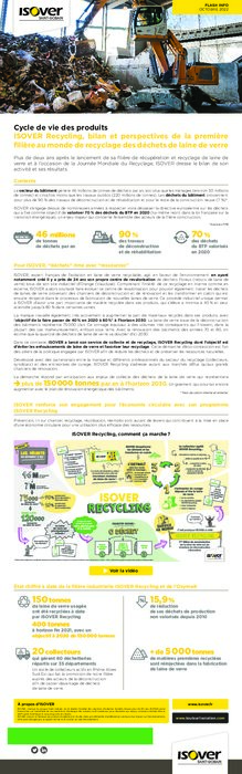 Industriels 26 octobre 2022 - 09:55 Plus de deux ans après le lancement de sa filière de récupération et recyclage de laine de verre et à l’occasion de la Journée Mondiale du Recyclage, ISOVER dresse le bilan de son activité et ses résultats. PDF (3 Mo) Télécharger