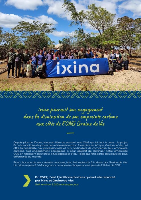 Depuis plus de 10 ans, ixina est fière de soutenir une ONG qui lui tient à cœur : le projet Eco-humanitaire de protection et de restauration forestière en Afrique, Graine de Vie, qui offre la possibilité aux professionnels et aux particuliers de compenser leur empreinte carbone.