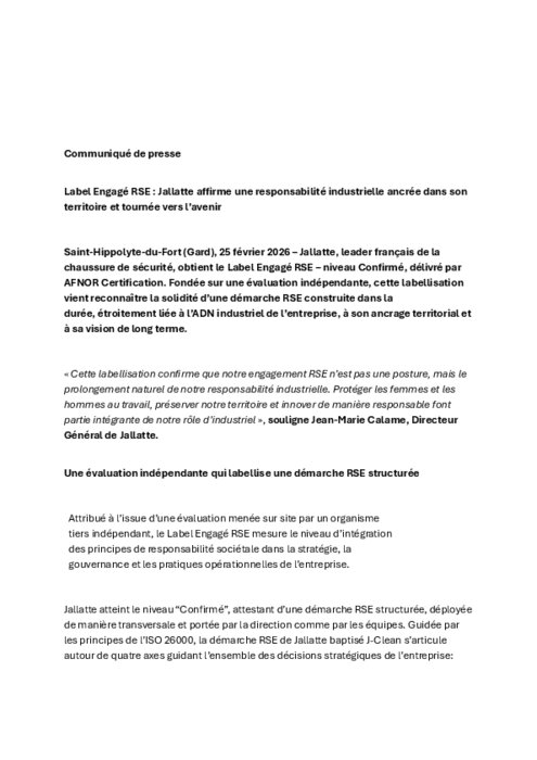 Jallatte, leader français de la chaussure de sécurité, obtient le Label Engagé RSE – niveau Confirmé, délivré par AFNOR Certification. Fondée sur une évaluation indépendante, cette labellisation vient reconnaître la solidité d’une démarche RSE construite dans la durée, étroitement liée à l’ADN industriel de l’entreprise, à son ancrage territorial et à sa vision de long terme.