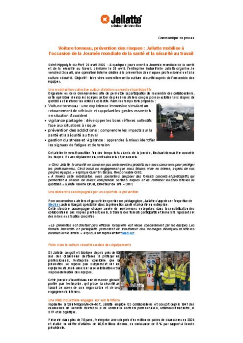 A quelques jours avant la Journée mondiale de la santé et de la sécurité au travail, célébrée le 28 avril, l’entreprise industrielle Jallatte organise, le vendredi 24 avril, une opération interne dédiée à la prévention des risques professionnels et à la culture sécurité. Objectif : faire vivre concrètement la culture sécurité auprès de l’ensemble des équipes.