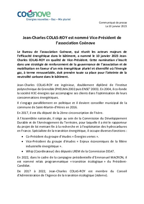Le Bureau de l’association Coénove, qui réunit les acteurs majeurs de l’efficacité énergétique dans le bâtiment, a nommé le 10 janvier 2023 Jean-Charles COLAS-ROY en qualité de Vice-Président. Cette nomination s’inscrit dans une stratégie de renforcement de la gouvernance de l’association et de mobilisation en faveur d’un mix énergétique pluriel et diversifié où l’énergie gaz, à terme renouvelable, doit prendre toute sa place pour l’atteinte de la neutralité carbone dans le bâtiment.