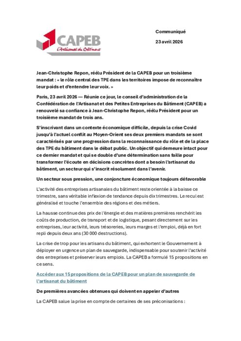 Le conseil d’administration de la Confédération de l’Artisanat et des Petites Entreprises du Bâtiment (Capeb) a renouvelé sa confiance à Jean-Christophe Repon, réélu Président pour un 3e mandat de 3 ans. S’inscrivant dans un contexte économique difficile, depuis la crise Covid jusqu’à l’actuel conflit au Moyen-Orient ses deux premiers mandats se sont caractérisés par une progression dans la reconnaissance du rôle et de la place des TPE du bâtiment dans le débat public.