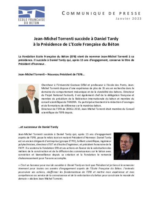 Institutionnels 09 janvier 2023 - 16:10 La Fondation Ecole Française du Béton (EFB) vient de nommer Jean-Michel Torrenti à sa présidence. Il succède à Daniel Tardy qui, après 15 ans d’engagement, conserve le titre de Président d’honneur. PDF (202 Ko) Télécharger