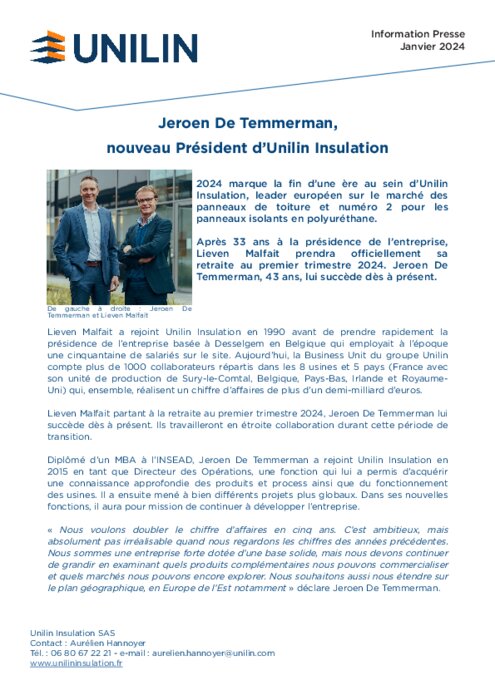 2024 marque la fin d’une ère au sein d’Unilin Insulation, leader européen sur le marché des panneaux de toiture et numéro 2 pour les panneaux isolants en polyuréthane. Après 33 ans à la présidence de l’entreprise, Lieven Malfait prendra officiellement sa retraite au premier trimestre 2024. Jeroen De Temmerman, 43 ans, lui succède dès à présent.