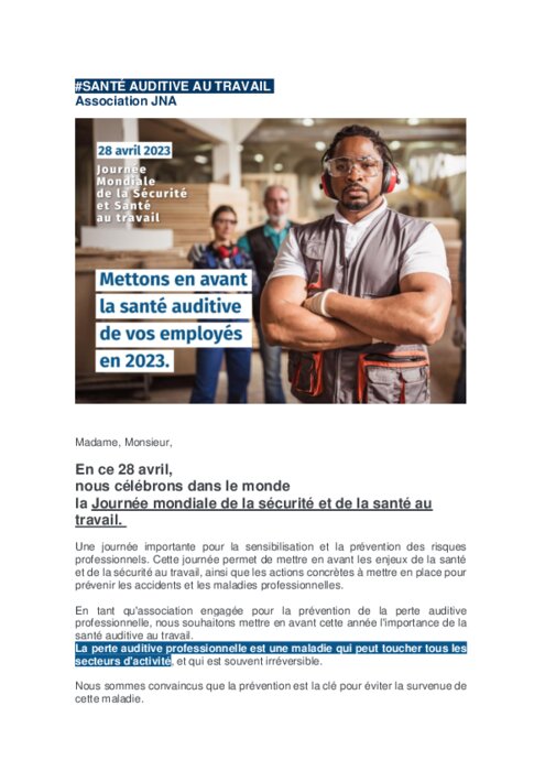 En tant qu'association engagée pour la prévention de la perte auditive professionnelle, JNA souhaite mettre en avant cette année l'importance de la santé auditive au travail. La perte auditive professionnelle est une maladie qui peut toucher tous les secteurs d'activité, et qui est souvent irréversible.