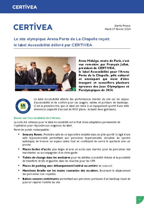 JO 2024 : CERTIVEA délivre le label Accessibilité à l'Arena Porte de La Chapelle