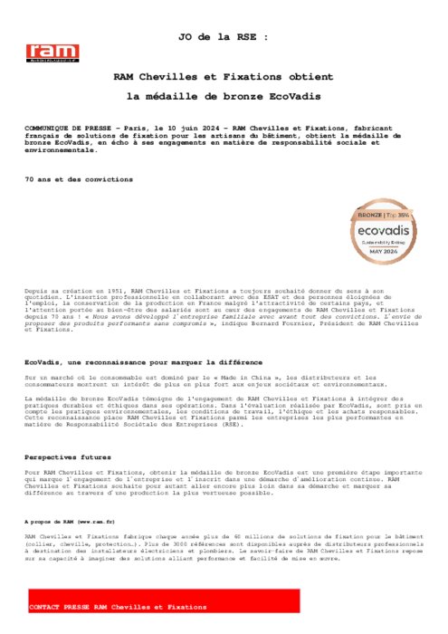 Industriels 10 juin 2024 - 09:48 RAM Chevilles et Fixations, fabricant français de solutions de fixation pour les artisans du bâtiment, obtient la médaille de bronze EcoVadis, en écho à ses engagements en matière de responsabilité sociale et environnementale. PDF (73 Ko) Télécharger
