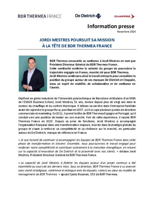 Cette continuité confirme la volonté du groupe de poursuivre la trajectoire engagée en France, marché clé pour BDR Thermea. Jordi Mestres continuera ainsi le travail entrepris pour consolider la position du groupe autour de ses marques De Dietrich et Chappée, dans un esprit de stabilité, de collaboration et de confiance en l’avenir.