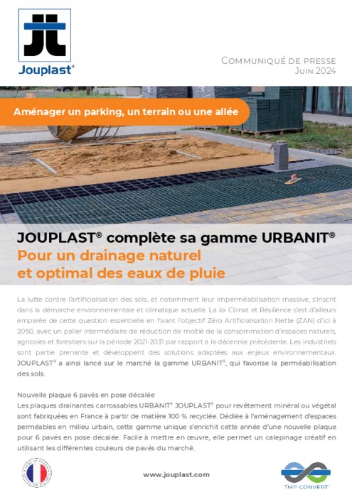 Les plaques drainantes carrossables URBANIT JOUPLAST pour revêtement minéral ou végétal sont fabriquées en France à partir de matière 100 % recyclée. Dédiée à l’aménagement d’espaces perméables en milieu urbain, cette gamme unique s’enrichit cette année d’une nouvelle plaque pour 6 pavés en pose décalée. Facile à mettre en œuvre, elle permet un calepinage créatif en utilisant les différentes couleurs de pavés du marché.