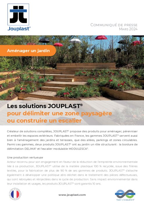 Créateur de solutions complètes, JOUPLAST propose des produits pour aménager, pérenniser et embellir les espaces extérieurs. Fabriquées en France, les gammes JOUPLAST servent aussi bien à l’aménagement des jardins et terrasses, que des allées, parkings et zones circulables. Parmi ces gammes, deux produits JOUPLAST ont au jardin un rôle structurant : la bordure de délimitation DELIMA et l’escalier modulable MODULESCA.