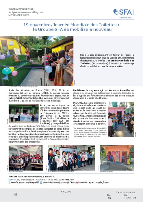 Après des initiatives en France (2011, 2018, 2019), au Cambodge (2016), au Sénégal (2017), le groupe tricolore inventeur du Sanibroyeur soutient financièrement depuis 2023, en Inde, le Sulabh School Sanitation Club avec, pour objectif principal, d’améliorer la qualité de vie dans des écoles indiennes.