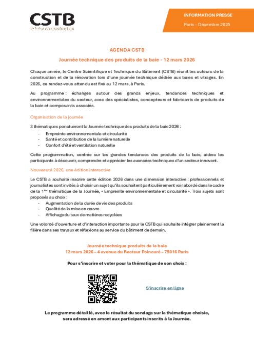 Chaque année, le Centre Scientifique et Technique du Bâtiment (CSTB) réunit les acteurs de la construction et de la rénovation lors d’une journée technique dédiée aux baies et vitrages. En 2026, ce rendez-vous attendu est fixé au 12 mars, à Paris.