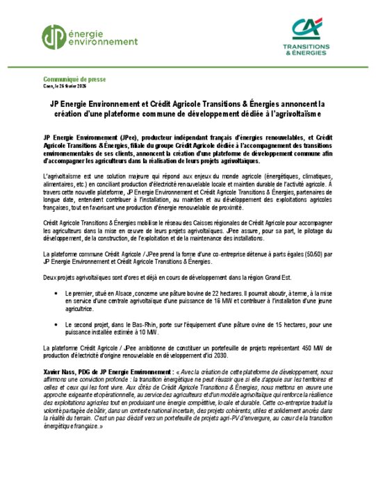 JP Energie Environnement (JPee), producteur indépendant français d’énergies renouvelables, et Crédit Agricole Transitions & Énergies, filiale du groupe Crédit Agricole dédiée à l’accompagnement des transitions environnementales de ses clients, annoncent la création d’une plateforme de développement commune afin d’accompagner les agriculteurs dans la réalisation de leurs projets agrivoltaïques.