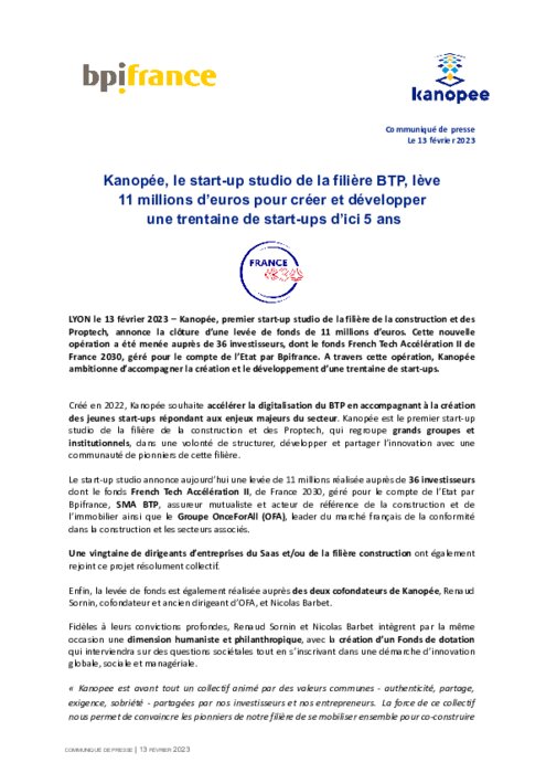 Kanopée, premier start-up studio de la filière de la construction et des Proptech, annonce la clôture d’une levée de fonds de 11 millions d’euros. Cette nouvelle opération a été menée auprès de 36 investisseurs, dont le fonds French Tech Accélération II de France 2030, géré pour le compte de l’Etat par Bpifrance. A travers cette opération, Kanopée ambitionne d’accompagner la création et le développement d’une trentaine de start-ups.