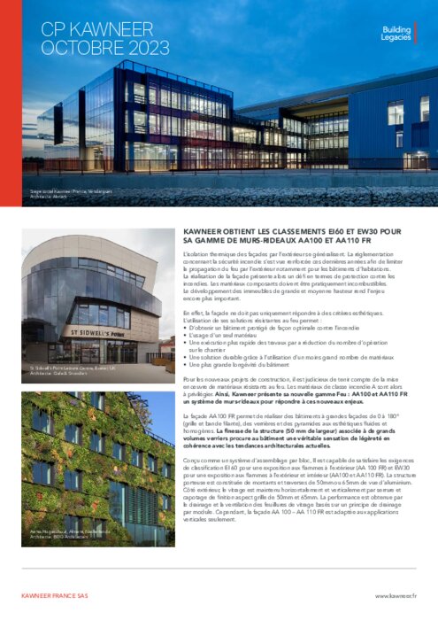 Pour les nouveaux projets de construction, il est judicieux de tenir compte de la mise en œuvre de matériaux résistants au feu. Les matériaux de classe incendie A sont alors à privilégier. Ainsi, Kawneer présente sa nouvelle gamme Feu : AA100 et AA110 FR un système de murs-rideaux pour répondre à ces nouveaux enjeux.