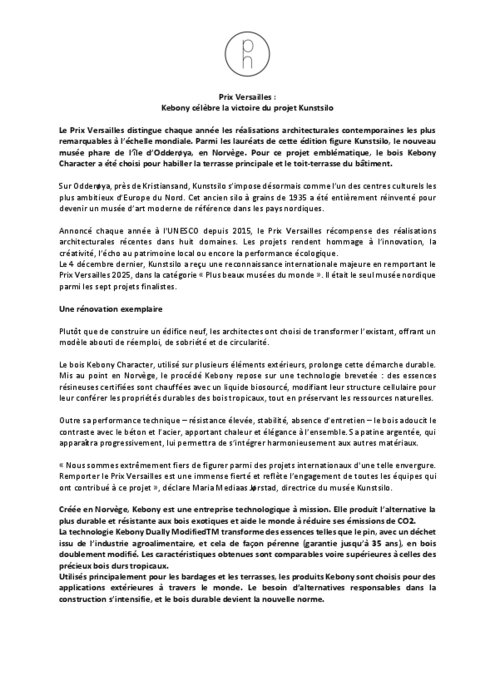 Le Prix Versailles distingue chaque année les réalisations architecturales contemporaines les plus remarquables à l’échelle mondiale. Parmi les lauréats de cette édition figure Kunstsilo, le nouveau musée phare de l’île d’Odderøya, en Norvège. Pour ce projet emblématique, le bois Kebony Character a été choisi pour habiller la terrasse principale et le toit-terrasse du bâtiment.