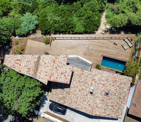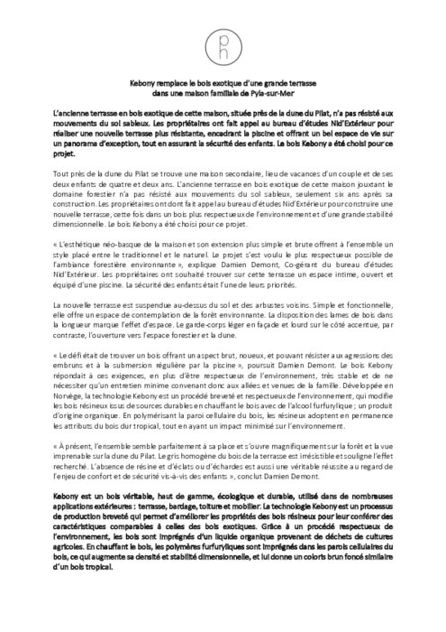 L’ancienne terrasse en bois exotique de cette maison, située près de la dune du Pilat, n’a pas résisté aux mouvements du sol sableux. Les propriétaires ont fait appel au bureau d’études Nid’Extérieur pour réaliser une nouvelle terrasse plus résistante, encadrant la piscine et offrant un bel espace de vie sur un panorama d’exception, tout en assurant la sécurité des enfants. Le bois Kebony a été choisi pour ce projet.