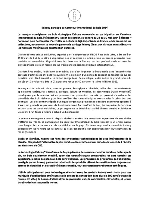 La marque norvégienne de bois écologique Kebony renouvelle sa participation au Carrefour International du Bois. L’événement, leader du secteur, se tiendra du 28 au 30 mai 2024 à Nantes – l’occasion pour l’entreprise d’accroître sa notoriété déjà importante en France, et de présenter ses collections, notamment sa nouvelle gamme de bardage Kebony Clear, aux visiteurs venus découvrir les meilleurs matériaux de construction durables.