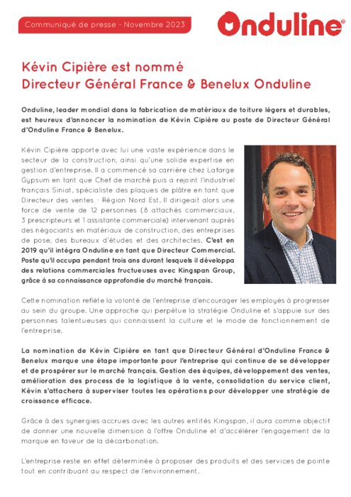 Industriels 22 novembre 2023 - 11:33 Onduline, leader mondial dans la fabrication de matériaux de toiture légers et durables, est heureux d’annoncer la nomination de Kévin Cipière au poste de Directeur Général d’Onduline France & Benelux. PDF (241 Ko) Télécharger