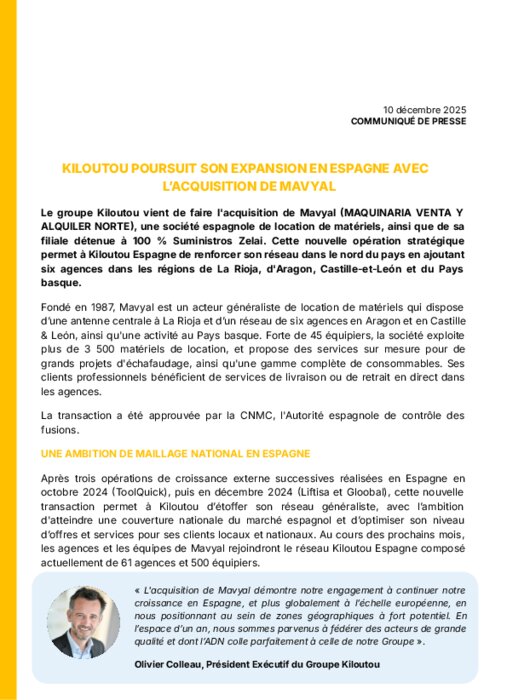 Le groupe Kiloutou vient de faire l'acquisition de Mavyal, une société espagnole de location de matériels, ainsi que de sa filiale détenue à 100 % Suministros Zelai. Cette nouvelle opération stratégique permet à Kiloutou Espagne de renforcer son réseau dans le nord du pays en ajoutant six agences dans les régions de La Rioja, d'Aragon, Castille-et-León et du Pays basque.