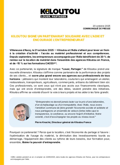 Kiloutou franchit une nouvelle étape dans son engagement solidaire en s’associant à l’Adie pour lever un frein majeur à la création d’entreprise : l’accès au matériel professionnel et à la formation. Grâce à ce partenariat, les entrepreneurs accompagnés par l’Adie bénéficient de remises sur la location d’équipements et les formations CACES, leur permettant de lancer ou développer leur activité dans les meilleures conditions.
