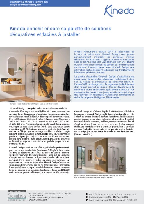 Kinedo révolutionne depuis 2017 la décoration de la salle de bains avec Kinewall Design, une gamme innovante de panneaux muraux décoratifs. En effet, qu’il s’agisse de créer une nouvelle salle de bains, remplacer une baignoire par une douche ou encore relooker rapidement et à moindres frais cet espace, Kinedo propose, avec Kinewall Design, une alternative judicieuse aux traditionnelles faïences et peintures murales.