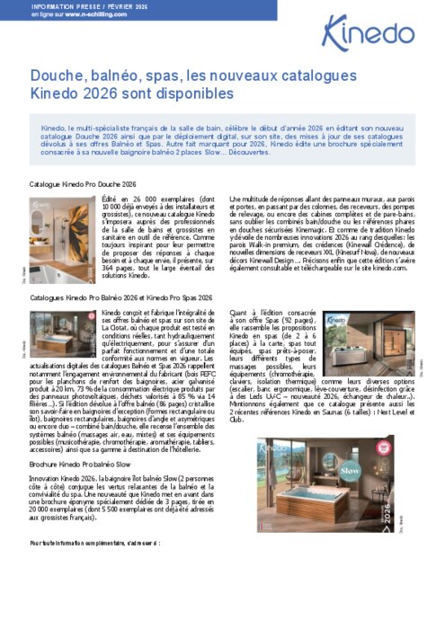 Kinedo, le multi-spécialiste français de la salle de bain, célèbre le début d’année 2026 en éditant son nouveau catalogue Douche 2026 ainsi que par le déploiement digital, sur son site, des mises à jour de ses catalogues dévolus à ses offres Balnéo et Spas.