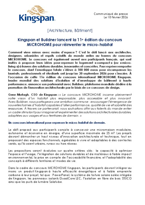 Comment vivre mieux avec moins d’espace ? C’est le défi lancé aux architectes, designers, urbanistes et esprits créatifs du monde entier au travers du concours Microhome. Le concours est également ouvert aux participants français, qui sont invités à proposer leurs idées pour repenser le logement « compact » (ou « micro-living ») à travers des solutions durables, innovantes et concrètes. Pour espérer remporter le concours, dont l’enveloppe totale s’élève à 100 000 euros pour récompenser les lauréats, professionnels et étudiants ont jusqu’au 30 septembre 2026 pour s’inscrire. À l’occasion de cette 11e édition du concours international Microhome, Kingspan, leader mondial des solutions d’isolation et d’enveloppe de bâtiment à haute performance, annonce son partenariat avec Buildner, plateforme mondiale dédiée à la promotion de l'innovation architecturale par le biais de ce concours de design.